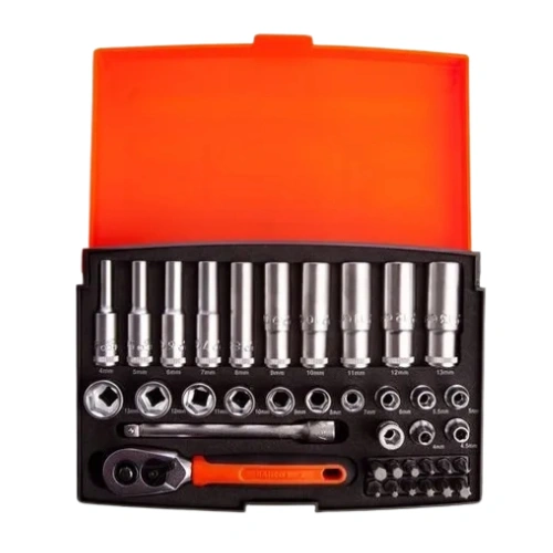 El juego de dados 1/4” hexagonales Bahco SL25L incluye 25 piezas esenciales para trabajos de precisión. Viene con dados cortos y largos (4–13 mm), puntas PH, PZ, HEX y TORX, además de una chicharra de 60 dientes, portapuntas y extensión angular. Todo organizado en un práctico estuche compacto. Ideal para reparaciones técnicas, electrónica, mecánica ligera y mantenimiento doméstico. ¡Versatilidad, calidad y portabilidad en un solo set!