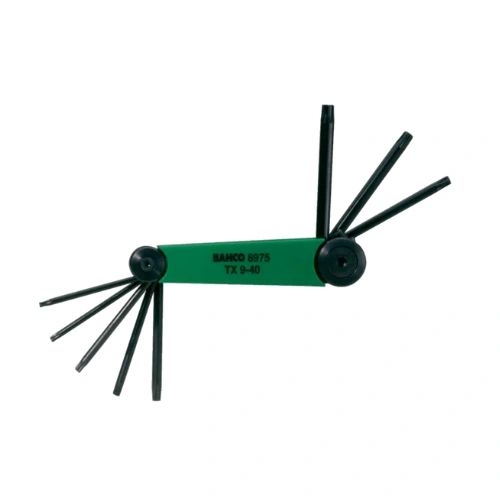 El juego BE-8975 incluye llaves Torx® en un diseño tipo navaja muy resistente, con medidas desde T9 hasta T40. Fabricadas en acero de alta calidad, permiten una transferencia de torque segura sin dañar la cabeza del tornillo. Este modelo es especialmente útil para electrónica, automoción y montaje de muebles, gracias a su versatilidad, resistencia y fácil transporte.